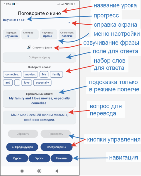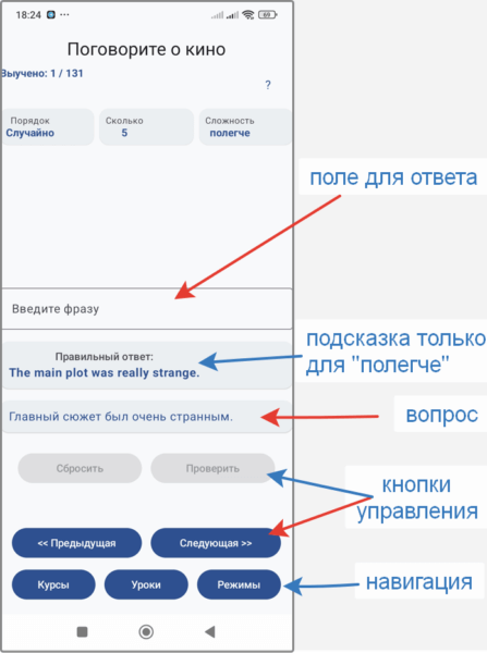 - «Полегче»: показан правильный ответ — вы можете набрать его по образцу. Используйте эту сложность только в самом начале изучения фраз, затем переходите в другую сложность.