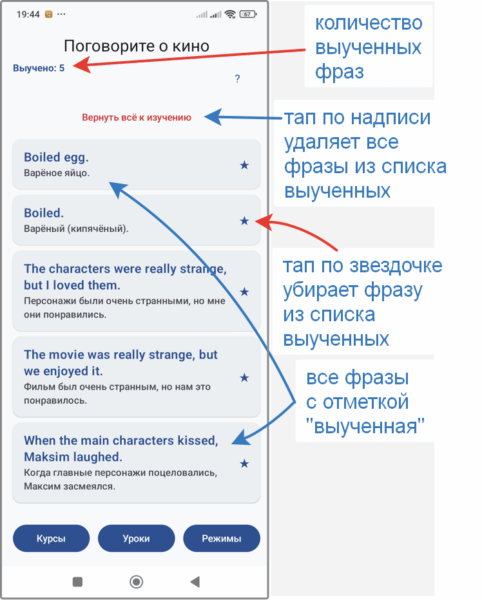 Пользователь может просмотреть список выученных фраз и вернуть некоторые фразы (тапнув по звездочке) или все фразы сразу (тапнув по соответствующей надписи) в список фраз для разучивания.