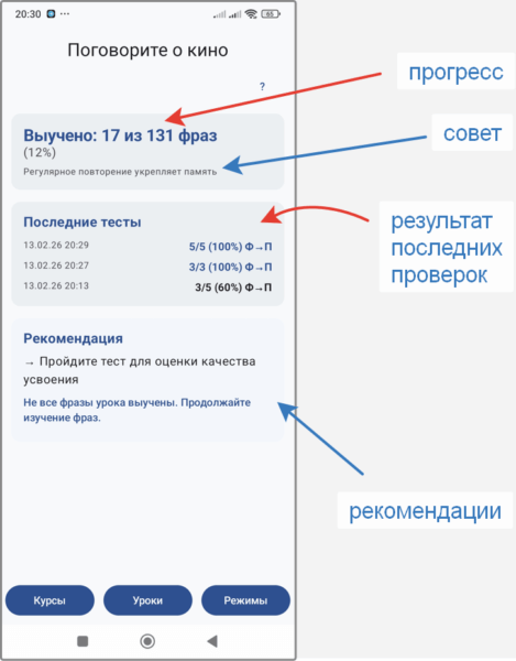 - прогресс обучения — сколько фраз выучено из общего числа фраз в уроке;