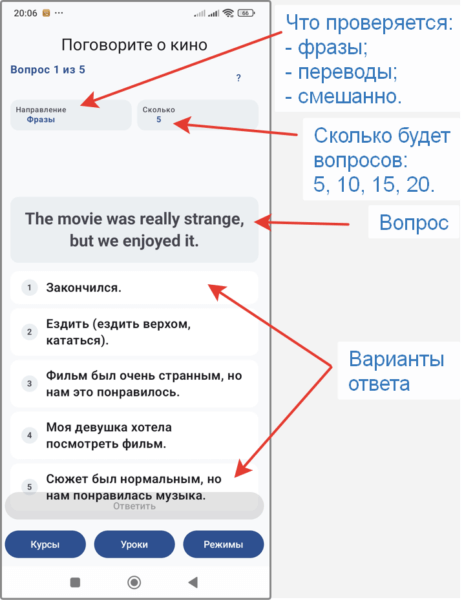Пользователю задается вопрос (фраза или перевод) и дается на выбор пять вариантов ответа.